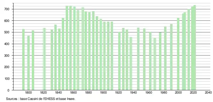 L'évolution du nombre d'habitants est connue à travers les recensements de la population effectués dans la commune depuis 1793. Pour les communes de moins de 10 000 habitants, une enquête de recensement portant sur toute la population est réalisée tous les cinq ans, les populations légales des années intermédiaires étant quant à elles estimées par interpolation ou extrapolation[20]. Pour la commune, le premier recensement exhaustif entrant dans le cadre du nouveau dispositif a été réalisé en 2008[21].