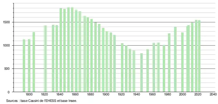 L'évolution du nombre d'habitants est connue à travers les recensements de la population effectués dans la commune depuis 1793. Pour les communes de moins de 10 000 habitants, une enquête de recensement portant sur toute la population est réalisée tous les cinq ans, les populations légales des années intermédiaires étant quant à elles estimées par interpolation ou extrapolation[34]. Pour la commune, le premier recensement exhaustif entrant dans le cadre du nouveau dispositif a été réalisé en 2007[35].