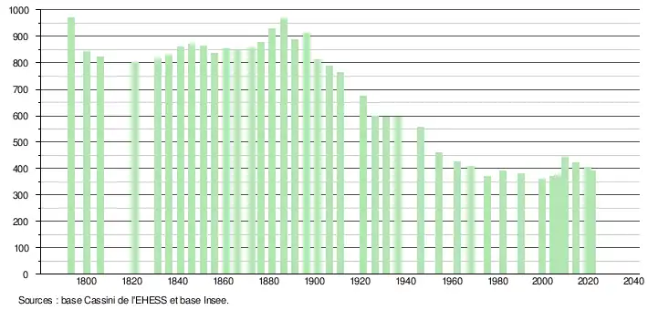 L'évolution du nombre d'habitants est connue à travers les recensements de la population effectués dans la commune depuis 1793. Pour les communes de moins de 10 000 habitants, une enquête de recensement portant sur toute la population est réalisée tous les cinq ans, les populations légales des années intermédiaires étant quant à elles estimées par interpolation ou extrapolation[20]. Pour la commune, le premier recensement exhaustif entrant dans le cadre du nouveau dispositif a été réalisé en 2004[21].