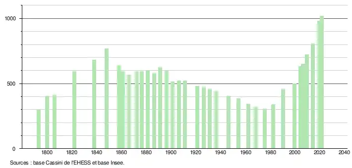L'évolution du nombre d'habitants est connue à travers les recensements de la population effectués dans la commune depuis 1793. Pour les communes de moins de 10 000 habitants, une enquête de recensement portant sur toute la population est réalisée tous les cinq ans, les populations légales des années intermédiaires étant quant à elles estimées par interpolation ou extrapolation[14]. Pour la commune, le premier recensement exhaustif entrant dans le cadre du nouveau dispositif a été réalisé en 2004[15].