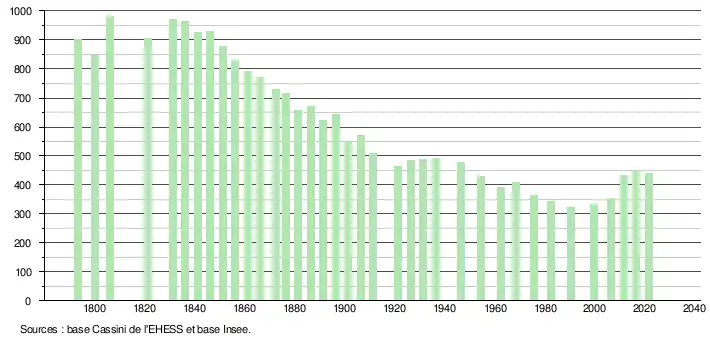 L'évolution du nombre d'habitants est connue à travers les recensements de la population effectués dans la commune depuis 1793. Pour les communes de moins de 10 000 habitants, une enquête de recensement portant sur toute la population est réalisée tous les cinq ans, les populations légales des années intermédiaires étant quant à elles estimées par interpolation ou extrapolation[21]. Pour la commune, le premier recensement exhaustif entrant dans le cadre du nouveau dispositif a été réalisé en 2006[22].
