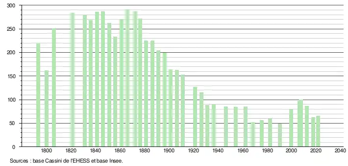 L'évolution du nombre d'habitants est connue à travers les recensements de la population effectués dans la commune depuis 1793. Pour les communes de moins de 10 000 habitants, une enquête de recensement portant sur toute la population est réalisée tous les cinq ans, les populations légales des années intermédiaires étant quant à elles estimées par interpolation ou extrapolation[16]. Pour la commune, le premier recensement exhaustif entrant dans le cadre du nouveau dispositif a été réalisé en 2007[17].