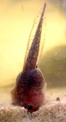 Les tétards de cette espèce, qui se nourrissent en pleine eau la nuit, présentent la particularité, le jour, de maintenir leur tête quasiment enfouie dans le sol et de s'alimenter de substrat. Cela a eu pour conséquence un renforcement de leur orifice buccal et de leurs papilles (qui se sont kératinisés) et une projection de leurs yeux en position latérale.