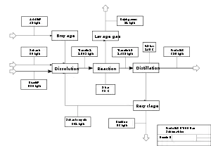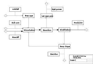 Un schéma bloc décrit un procédé ou une unité de fabrication en utilisant des cadres rectangulaires incluant des données clefs et en indiquant les relations ou les flux reliant les différents cadres.