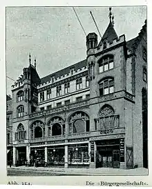Là où se trouvent aujourd'hui les magasins Kö-Bogen II dans la Schadowstraße, l'immeuble d'habitation de la Schadowstraße 40 appartenant à la veuve Brügelmann sur un terrain de 3 182 m2 avec un grand et beau jardin estacheté en 1897 et devient jusqu'en 1900 la « Maison de Société Civile » selon les plans de l'architecte Leo von Abbema (de). Il y a un grand magasin au rez-de-chaussée, un restaurant au premier étage et un hôtel de 40 lits aux étages supérieurs : vers l'arrière se trouvaient de grandes salles de réception et de vastes caves à vin pour le commerce du vin. Un grand jardin avec une terrasse et un boulodrome intégré offre également un espace pour jouer au tennis.