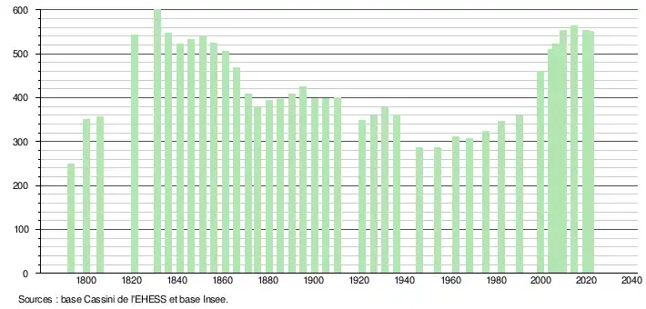 L'évolution du nombre d'habitants est connue à travers les recensements de la population effectués dans la commune depuis 1793. Pour les communes de moins de 10 000 habitants, une enquête de recensement portant sur toute la population est réalisée tous les cinq ans, les populations légales des années intermédiaires étant quant à elles estimées par interpolation ou extrapolation[17]. Pour la commune, le premier recensement exhaustif entrant dans le cadre du nouveau dispositif a été réalisé en 2004[18].