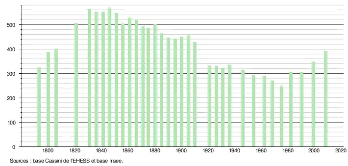 L'évolution du nombre d'habitants est connue à travers les recensements de la population effectués dans la commune depuis 1793. À partir du , les populations légales des communes sont publiées annuellement dans le cadre d'un recensement qui repose désormais sur une collecte d'information annuelle, concernant successivement tous les territoires communaux au cours d'une période de cinq ans. Pour les communes de moins de 10 000 habitants, une enquête de recensement portant sur toute la population est réalisée tous les cinq ans, les populations légales des années intermédiaires étant quant à elles estimées par interpolation ou extrapolation[2]. Pour la commune, le premier recensement exhaustif entrant dans le cadre du nouveau dispositif a été réalisé en 2008[3],[Note 1].