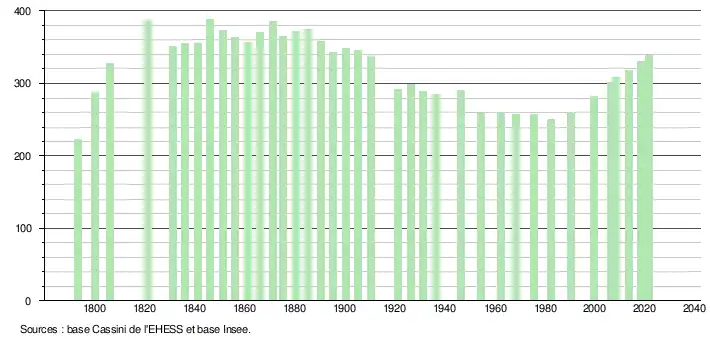 L'évolution du nombre d'habitants est connue à travers les recensements de la population effectués dans la commune depuis 1793. Pour les communes de moins de 10 000 habitants, une enquête de recensement portant sur toute la population est réalisée tous les cinq ans, les populations légales des années intermédiaires étant quant à elles estimées par interpolation ou extrapolation[27]. Pour la commune, le premier recensement exhaustif entrant dans le cadre du nouveau dispositif a été réalisé en 2008[28].