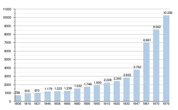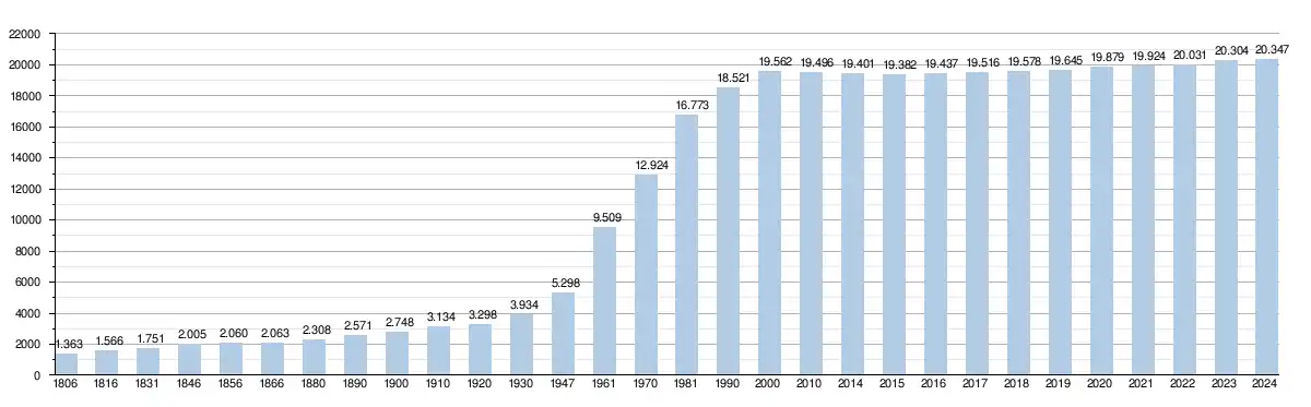 - Source : DGS - Remarque: 1806 jusqu'à 1981=recensement; depuis 1990=nombre d'habitants chaque 1er janvier[6]