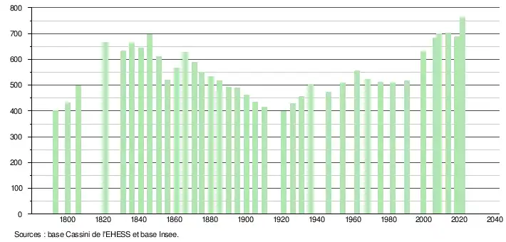 L'évolution du nombre d'habitants est connue à travers les recensements de la population effectués dans la commune depuis 1793. Pour les communes de moins de 10 000 habitants, une enquête de recensement portant sur toute la population est réalisée tous les cinq ans, les populations légales des années intermédiaires étant quant à elles estimées par interpolation ou extrapolation[19]. Pour la commune, le premier recensement exhaustif entrant dans le cadre du nouveau dispositif a été réalisé en 2008[20].