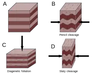 - schistosité cristallophyllienne ou foliation : cristallisation de nouveaux minéraux en paillettes dans les plans de schistosité[4].