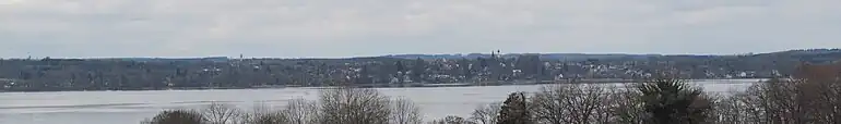 Vue de Schondorf des bords du lac avec l'église Saint-Jacques à gauche | |