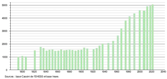 L'évolution du nombre d'habitants est connue à travers les recensements de la population effectués dans la commune depuis 1793. Pour les communes de moins de 10 000 habitants, une enquête de recensement portant sur toute la population est réalisée tous les cinq ans, les populations légales des années intermédiaires étant quant à elles estimées par interpolation ou extrapolation[21]. Pour la commune, le premier recensement exhaustif entrant dans le cadre du nouveau dispositif a été réalisé en 2007[22].