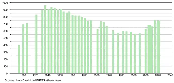 L'évolution du nombre d'habitants est connue à travers les recensements de la population effectués dans la commune depuis 1793. Pour les communes de moins de 10 000 habitants, une enquête de recensement portant sur toute la population est réalisée tous les cinq ans, les populations légales des années intermédiaires étant quant à elles estimées par interpolation ou extrapolation[17]. Pour la commune, le premier recensement exhaustif entrant dans le cadre du nouveau dispositif a été réalisé en 2004[18].