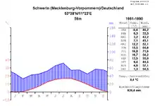 Schwerin jouit d'un climat tempéré. Ainsi de 1961 à 1990, la moyenne inter-annuelle de température était de 8,4 °C. L'amplitude thermique moyenne n'est que de 17,2 °C. Le volume annuel des précipitations s'élève à 621 mm/m2. Par rapport au Nord-ouest de l’Allemagne, les printemps y sont plus frais, du fait de la rigueur des vents du nord-est. La chaleur estivale est tempérée par la mer Baltique, qui réchauffe également les terres à l’automne.