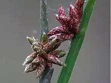 La bractée fertile inférieure est plus grande que l’inflorescence. Les épillets sont assez gros (4-12 mm), roussâtres, ovoïdes à oblongs, nombreux (2 à 20) tous sessiles et agglomérés en tête latérale compacte longuement dépassée par une bractée triquètre à la fin étalée ou réfléchie ; les glumes de 3 à 4 mm, largement obovales, sont obtuses, mucronées, rougeâtres à nervure verte. Il y a habituellement six soies, scabres rétrorses, un peu plus grandes que l’akène. Les akènes font 1,5 à 2,5 mm, sont obovoïdes, à 3 gones, brun noirâtre, ruguleux transversalement. Il y a trois stigmates[1],[2].