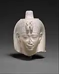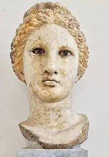 Portrait de Cléopâtre issu d'une statue (perdue) de la reine, de taille naturelle. Règne 40-30 AEC. Trace de violet sur le diadème. Découverte inconnue.