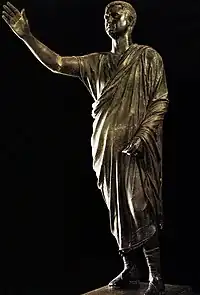 De nombeux portraits, dont les plus nombreux sont, aujourd'hui, en marbre, témoignent de l'exigence à respecter les traits spécifiques à chaque personne. Le portrait de l'orateur Cicéron est bien connu, la bouche très légèrement ouverte, prêt à parler. C'est avec le même respect pour le portrait naturel, non idéalisé, qu'a été taillé le portrait d'une jeune fille de Vulci, datant de cette époque républicaine ou des premières années du principat d'Auguste. Le visage de la jeune fille, aux traits délicats et gracieux, est coiffé sobrement mais le marbre était autrefois enrichi d'inserts d'or et de pierres précieuses[70]. Cet attachement à représenter le visage du personnage tel qu'il est conduit aussi, parfois, à placer la tête sur un corps différent, iéalement athlétique. C'est ce qui est arrivé à ce portrait d'un romain trouvé à Délos, plus grand que nature et dont la tête a les oreilles décollées mais le corps d'un héros, un colosse, même. Ce type de commande, comme cette statue équestre d'un habitant d'Herculanum, indique clairement qu'une partie de la bourgeoisie romaine ou italienne utilisait l'art comme un moyen de valoriser leur famille[71].