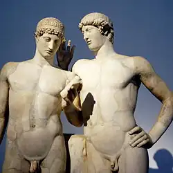 Le groupe d'Oreste et Pylade en est un exemple parfait, et admirablement restauré, car les deux corps ont été manifestement retrouvés en morceaux, plus ou moins érodés. La lettre et la main qui la tient ont, d'ailleurs, été ajoutées à l'époque moderne. Ces deux éphèbes semblent discuter à propos de cette lettre. On peut, aujourd'hui, reconnaître la scène en question. En effet, les Romains appréciaient la littérature grecque, et ici il s'agit d'un passage des Argonautiques d'Apollonios de Rhodes (vers 295 – vers 215 AEC). Oreste, fils du roi Agamemnon et de Clytemnestre, et son ami, Pylade, doivent être sacrififiés sur l'autel de la déesse Artémis, dans un sanctuaire de Tauride. Mais à cet instant Oreste reçoit une lettre de sa sœur, Iphigénie, elle-même prêtresse de cette déesse. Dans la lettre elle leur propose de les sauver. Voilà pour l'histoire. Quant à la sculpture, elle donne à celui de gauche, Oreste, les caractéristiques d'une statue du sculpteur Stéphanos, du Ier siècle AEC, mais ce sculpteur reprend des motifs du style grec sévère (480/460 AEC). À côté d'Oreste, son compagnon, Pylade, est une combinaison de références à Praxitèle (vers 395-326) pour le corps et de motifs empruntés au style sévère : les cheveux enroulés autour d'un bandeau et les tresses croisées sur la nuque. Ce groupe a été produit, parmi tant d'autres semblables, pour servir de décoration, à la fin de l'époque républicaine ou au début de l'époque impériale, dans cette forme de pastiche néoclassique qui plaisait tant aux élites romaines[26].