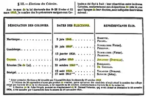En 1848, la Seconde République abolit de nouveau l'esclavage (décret d'abolition de l'esclavage du 27 avril 1848) et ré-assimila ces territoires à la métropole avec comme conséquence l'arrivée à Paris de députés des colonies (onze députés en 1849)[1]. Un décret du crée les départements français d'Algérie.