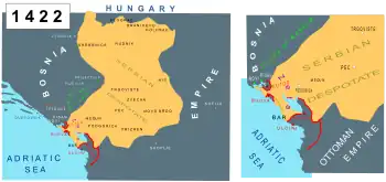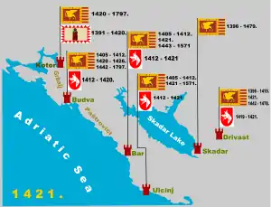 Đurađ Branković succéda à Stefan Lazarević après sa mort en 1427 et perdit le contrôle de Bar aux Vénitiens en 1443[29].