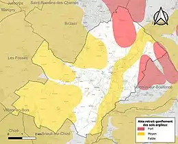 Les mouvements de terrains susceptibles de se produire sur la commune sont des tassements différentiels[17]. Le retrait-gonflement des sols argileux est susceptible d'engendrer des dommages importants aux bâtiments en cas d’alternance de périodes de sécheresse et de pluie[18]. 67,1 % de la superficie communale est en aléa moyen ou fort (54,9 % au niveau départemental et 48,5 % au niveau national)[Carte 2]. Depuis le , en application de la loi ELAN, différentes contraintes s'imposent aux vendeurs, maîtres d'ouvrages ou constructeurs de biens situés dans une zone classée en aléa moyen ou fort[Note 3],[19].
