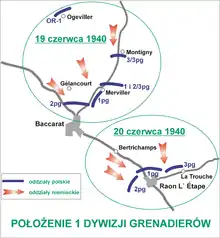 Ce , 1 123 soldats polonais à court de munitions sont capturés à Azoudange[6], au sud-est de Dieuze. 300, faute de véhicules, le sont à Gelucourt, au sud du même chef-lieu de canton, mais le reste du 2e Bataillon du RGP et son commandant Wrona échappent aux camions de la 60e DI qui les avaient dépassés[6]. Les fantassins allemands souffrent cependant du manque d'appui blindé, artillerie et cavalerie étant retardées par les inondations et par les destructions de pont opérées par les sapeurs durant la manœuvre de freinage[6].