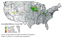 L'explosion de Sedan a créé un nuage radioactif qui s'est séparé en deux panaches, à des altitudes de 3 et 4,9 km. Les deux panaches ont dérivé au nord-est, puis à l'est, suivant des trajectoires grossièrement parallèles vers l'océan Atlantique[10]. Des retombées radioactives ont été semées sur leur trajet, dispersées étroitement dans un relativement petit nombre de comtés des États-Unis[4]. La radioactivité relevée était particulièrement haute dans huit comtés d'Iowa, et un comté du Nebraska, du Dakota du Sud, et de l'Illinois. Les comtés les plus touchés ont été ceux d'Howard, de Mitchell et les comtés de Worth en Iowa, de même que le comté de Washabaugh au Dakota du Sud, une zone qui a depuis été incorporée dans le comté de Jackson et qui fait entièrement partie de la réserve indienne de Pine Ridge. Ces quatre comtés ont été exposés à des niveaux supérieurs à 6 millicuries par mètre carré (220 MBq/m2)[11].