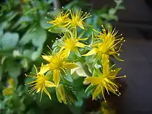 Elle donne de nombreuses fleurs jaune d'environ 2 cm de diamètre portées par une cyme multipare et caractérisées par 5 sépales et 5 pétales pointus autour de nombreuses étamines plus longues que ceux-ci. Sa floraison précoce au printemps (plus tôt si les plantes ont été rentrées au chaud) en fait une plante mellifère intéressante.