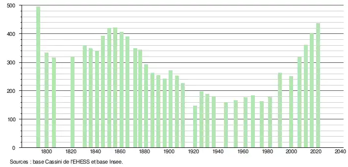 L'évolution du nombre d'habitants est connue à travers les recensements de la population effectués dans la commune depuis 1793. Pour les communes de moins de 10 000 habitants, une enquête de recensement portant sur toute la population est réalisée tous les cinq ans, les populations légales des années intermédiaires étant quant à elles estimées par interpolation ou extrapolation[16]. Pour la commune, le premier recensement exhaustif entrant dans le cadre du nouveau dispositif a été réalisé en 2006[17].