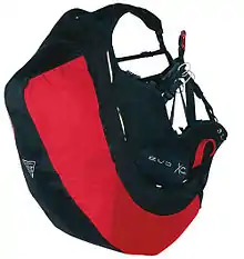 Renforcée, avec souvent deux poches séparées de parachute de secours, avec un écartement de la ventrale maximal, et une assiette assez basse pour renforcer la commande au poids du corps.