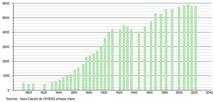 L'évolution du nombre d'habitants est connue à travers les recensements de la population effectués dans la commune depuis 1793. Pour les communes de moins de 10 000 habitants, une enquête de recensement portant sur toute la population est réalisée tous les cinq ans, les populations légales des années intermédiaires étant quant à elles estimées par interpolation ou extrapolation[27]. Pour la commune, le premier recensement exhaustif entrant dans le cadre du nouveau dispositif a été réalisé en 2006[28].