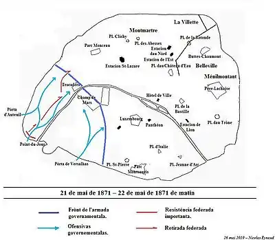 Des combats ont lieu place de Clichy et aux Batignolles. Les Allemands autorisent les Versaillais à traverser la zone neutre au nord de Paris, ce qui leur permet de prendre les Batignolles à revers.