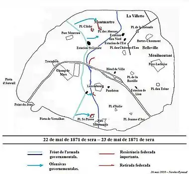 Le Comité de salut public et le Comité central de la Garde nationale font placarder, à l'intention des soldats versaillais, des appels à la fraternisation. En vain[réf. nécessaire]. Les hostilités cessent aux Batignolles malgré les efforts des troupes commandées par Benoît Malon et la butte Montmartre tombe pratiquement sans combat du fait de la désorganisation. Selon Lissagaray, quarante-deux hommes, trois femmes et quatre enfants ramassés au hasard sont conduits au no 6 de la rue des Rosiers, contraints de fléchir les genoux, tête nue, devant le mur au pied duquel les généraux ont été exécutés le 18 mars, puis ils sont fusillés. Dombrowski est tué rue Myrha. La résistance persiste à la Butte-aux-Cailles (avec Walery Wroblewski), au Panthéon (avec Lisbonne), dans les rues de l'Université, Saint-Dominique, Vavin, de Rennes et à la gare de l'Est. Les Versaillais occupent l'Opéra, le faubourg Montmartre et la Concorde, ils atteignent l'Observatoire et procèdent à des exécutions massives à Montmartre, au parc Monceau et à la Madeleine. C’est le début des grands incendies qui vont ravager de nombreux monuments parisiens.