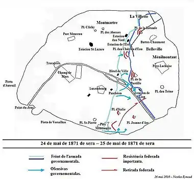 Les communards ne tiennent plus qu'un « quadrilatère » : canal de l'Ourcq, bassin de la Villette, canal Saint-Martin, boulevard Richard-Lenoir, rue du Faubourg-Saint-Antoine et porte de Vincennes.
