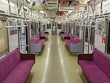 L'organisation des places assises est en longitudinal, ce qui est habituel au Japon pour les lignes de banlieue. Des emplacements porte- bagages sont présents au-dessus des sièges.