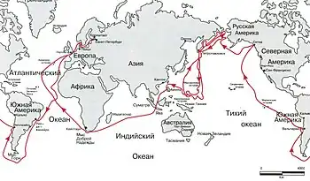 Le Séniavine part de Kronstadt le . Il est rejoint à Copenhague par le Moller du capitaine Mikhaïl Stanioukevitch, et les deux navires s'arrêtent un mois à Londres, pour acheter toute sorte de matériel scientifique et de l'approvisionnement. Le Séniavine et le Moller traversent ensuite la Manche au large de Portsmouth et descendent l'Atlantique. Il s'arrêtent aux Açores, passent le Cap-Vert, puis continuent en direction de Rio de Janeiro pour y mouiller. Ils arrivent en . Ensuite les navires passent les Malouines puis le cap Horn le et remontent par les côtes chiliennes où ils s'arrêtent à Valparaiso. Entretemps ils effectuent des observations physiques et astronomiques. L'expédition prend le cap au nord-ouest vers les îles Marquises, puis remonte jusqu'à Sitka (Novo-Arkhangelsk) petit fort russe dans l'actuel Alaska, à l'époque possession russe, où elle arrive en . Les naturalistes y découvrent dans les environs de nombreuses nouvelles espèces animales ou botaniques (dont Tsuga mertensiana) et y étudient les mœurs des tribus locales.