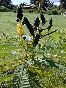 Le fruit est une gousse plate brune mesurant jusqu'à 12 centimètres de long, qui contient jusqu'à 16 graines d'un centimètre de long chacun ressemblantes à des haricots.