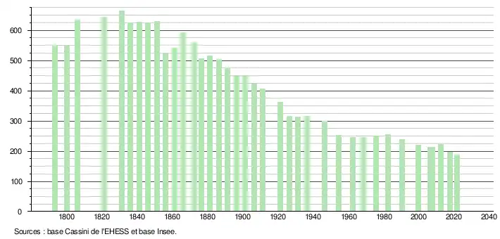L'évolution du nombre d'habitants est connue à travers les recensements de la population effectués dans la commune depuis 1793. Pour les communes de moins de 10 000 habitants, une enquête de recensement portant sur toute la population est réalisée tous les cinq ans, les populations légales des années intermédiaires étant quant à elles estimées par interpolation ou extrapolation[20]. Pour la commune, le premier recensement exhaustif entrant dans le cadre du nouveau dispositif a été réalisé en 2007[21].