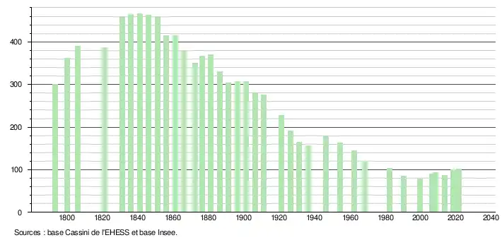 L'évolution du nombre d'habitants est connue à travers les recensements de la population effectués dans la commune depuis 1793. Pour les communes de moins de 10 000 habitants, une enquête de recensement portant sur toute la population est réalisée tous les cinq ans, les populations légales des années intermédiaires étant quant à elles estimées par interpolation ou extrapolation[15]. Pour la commune, le premier recensement exhaustif entrant dans le cadre du nouveau dispositif a été réalisé en 2008[16].