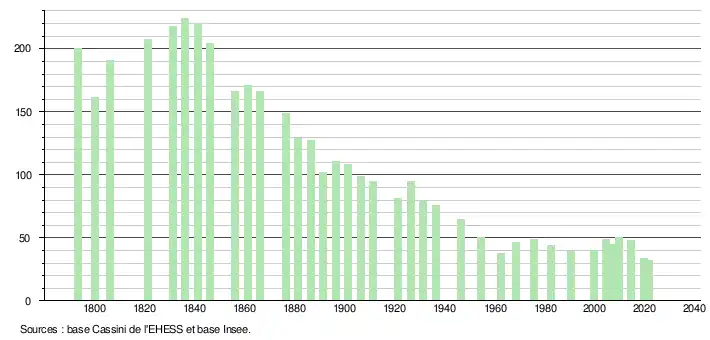 L'évolution du nombre d'habitants est connue à travers les recensements de la population effectués dans la commune depuis 1793. Pour les communes de moins de 10 000 habitants, une enquête de recensement portant sur toute la population est réalisée tous les cinq ans, les populations légales des années intermédiaires étant quant à elles estimées par interpolation ou extrapolation[15]. Pour la commune, le premier recensement exhaustif entrant dans le cadre du nouveau dispositif a été réalisé en 2004[16].