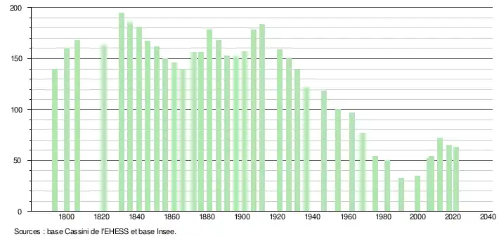 L'évolution du nombre d'habitants est connue à travers les recensements de la population effectués dans la commune depuis 1793. Pour les communes de moins de 10 000 habitants, une enquête de recensement portant sur toute la population est réalisée tous les cinq ans, les populations légales des années intermédiaires étant quant à elles estimées par interpolation ou extrapolation[18]. Pour la commune, le premier recensement exhaustif entrant dans le cadre du nouveau dispositif a été réalisé en 2007[19].