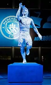 Le , le club anglais de Manchester City recrute Agüero contre un chèque d'environ 45 millions d'euros[41]. Il marque lors de son premier match avec le maillot mancunien face à Swansea City (4-0). Lors de cette rencontre, l'ancien colchoneros réalise une prestation de très haut niveau qui lui vaut la distinction d'Homme du match, auteur d'un doublé (dont une frappe croisée des 30 mètres) et d'une passe décisive à David Silva[42]. Avec l'accord de la ligue anglaise, l'Argentin évolue à City avec un maillot floqué de son surnom "Kun", comme dans ses précédents clubs[43].