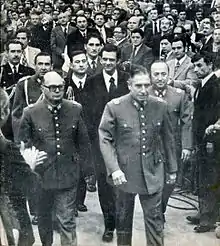 Augusto Pinochet avec le général César Benavides suivi de Sergio Fernández Fernández lors d'un événement au bâtiment Diego Portales (siège du ministère de la Défense nationale), 1er mai 1976.