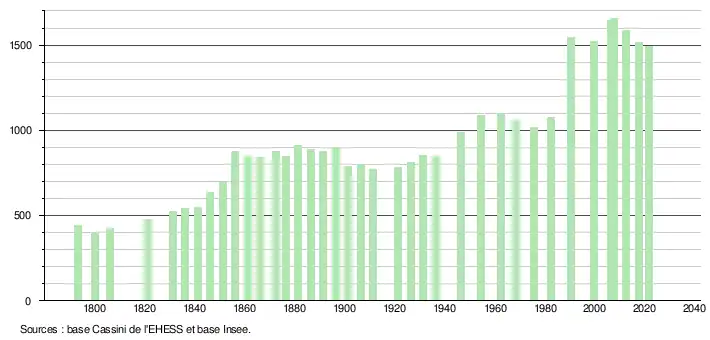 L'évolution du nombre d'habitants est connue à travers les recensements de la population effectués dans la commune depuis 1793. Pour les communes de moins de 10 000 habitants, une enquête de recensement portant sur toute la population est réalisée tous les cinq ans, les populations légales des années intermédiaires étant quant à elles estimées par interpolation ou extrapolation[19]. Pour la commune, le premier recensement exhaustif entrant dans le cadre du nouveau dispositif a été réalisé en 2007[20].