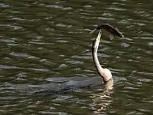 L'oiseau-serpent nage et même plonge, tenant seulement la tête hors de l'eau.