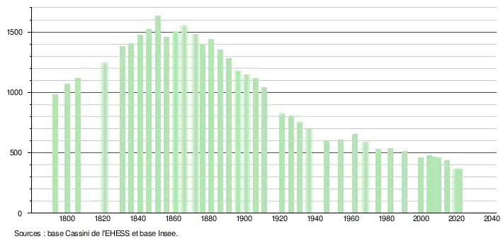 L'évolution du nombre d'habitants est connue à travers les recensements de la population effectués dans la commune depuis 1793. Pour les communes de moins de 10 000 habitants, une enquête de recensement portant sur toute la population est réalisée tous les cinq ans, les populations légales des années intermédiaires étant quant à elles estimées par interpolation ou extrapolation[14]. Pour la commune, le premier recensement exhaustif entrant dans le cadre du nouveau dispositif a été réalisé en 2004[15].