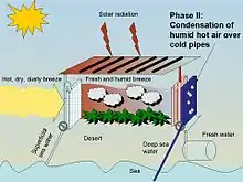 ![]() Figure 2. À l'intérieur l'effet de serre - condensation : la vapeur d'eau est produite en utilisant l'eau de mer supplémentaires chauffée par le soleil et ensuite condensée sur les tubes contenant l'eau de mer froide |