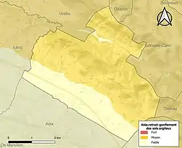 Le retrait-gonflement des sols argileux est susceptible d'engendrer des dommages importants aux bâtiments en cas d’alternance de périodes de sécheresse et de pluie[27]. 70,6 % de la superficie communale est en aléa moyen ou fort (59 % au niveau départemental et 48,5 % au niveau national)[Carte 4]. Depuis le , en application de la loi ELAN, différentes contraintes s'imposent aux vendeurs, maîtres d'ouvrages ou constructeurs de biens situés dans une zone classée en aléa moyen ou fort[Note 7],[28].