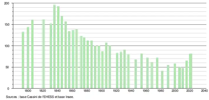 L'évolution du nombre d'habitants est connue à travers les recensements de la population effectués dans la commune depuis 1793. Pour les communes de moins de 10 000 habitants, une enquête de recensement portant sur toute la population est réalisée tous les cinq ans, les populations légales des années intermédiaires étant quant à elles estimées par interpolation ou extrapolation[29]. Pour la commune, le premier recensement exhaustif entrant dans le cadre du nouveau dispositif a été réalisé en 2005[30].